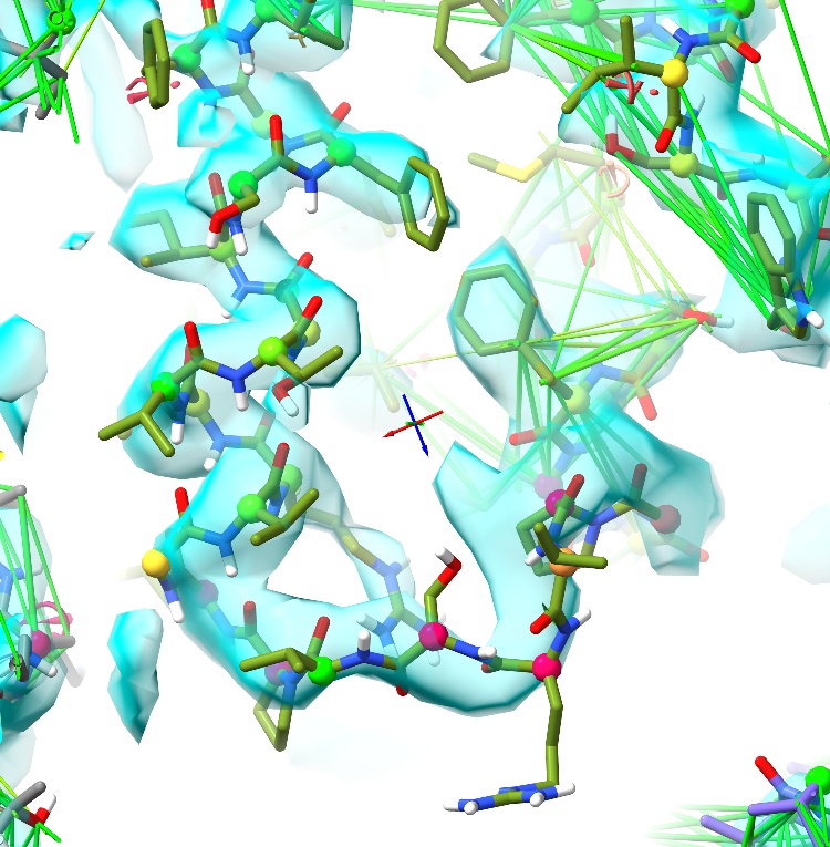 For each displayed restraint, the radius of the depiction scales with applied force, while the colour changes according to how stretched or compressed it is. The thin, purple bonds here have been stretched to the point where they are applying almost no force - they have “given way” to the conformational change imposed by the map - but importantly, the local conformation is still imposed by the restraints coloured in green.